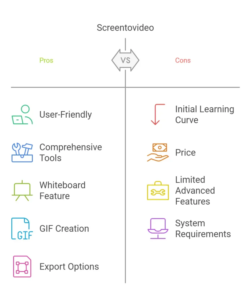 ScreenToVideo is a robust yet user-friendly tool for screen recording and video editing. It offers a host of features that cater to both beginners and seasoned creators. But like any software, it has its strengths and areas for improvement. Let’s explore the pros and cons of ScreenToVideo.