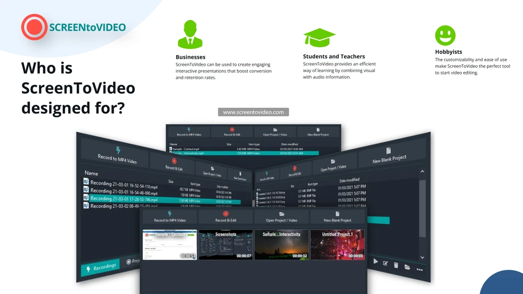 Screentovideo is ideal for anyone needing to create and edit videos. This includes educators, content creators, business professionals, and students. Its user-friendly interface makes it accessible to users of all skill levels.