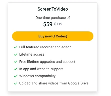 The ScreenToVideo Lifetime Deal is available at a one-time payment of $59, discounted from the original price of $119. This deal includes: