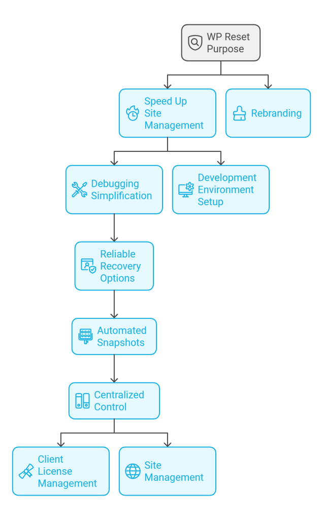 The main purpose of WP Reset is to speed up site management and rebranding. It simplifies debugging by removing unused widgets and streamlines the setup of development environments with bulk plugin/theme installation. WP Reset also provides reliable recovery options for hacked or malfunctioning sites. Automated snapshots make restoration easy. Centralized control over client licenses, sites, and more adds to its utility.